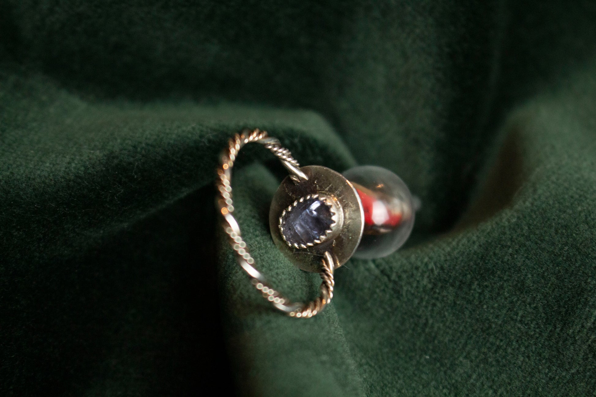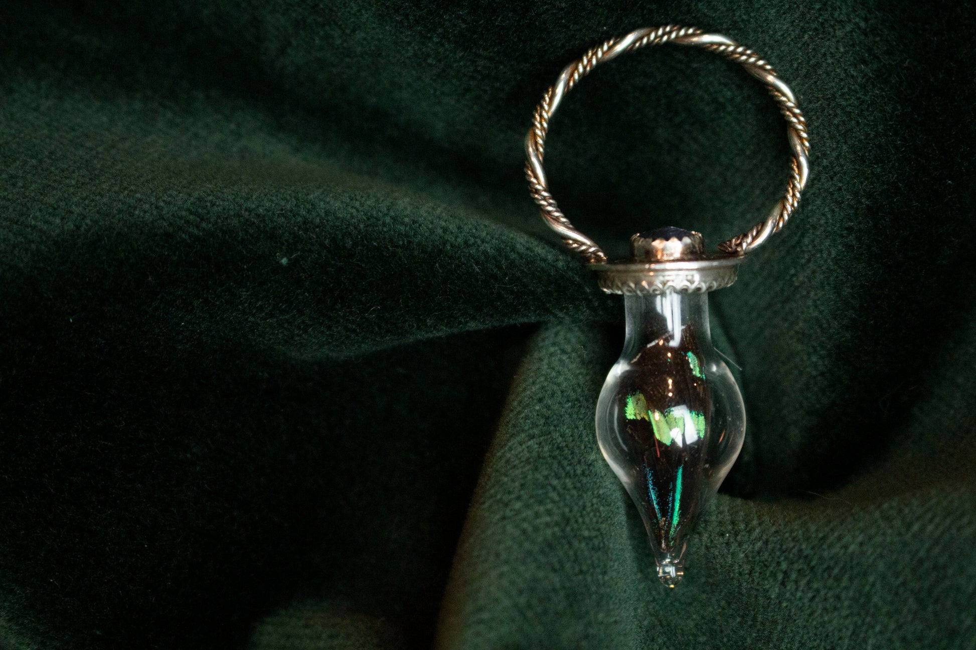 A delicate butterfly wing encased in a small glass jar, with a small sparkling tanzanite stone set above it.