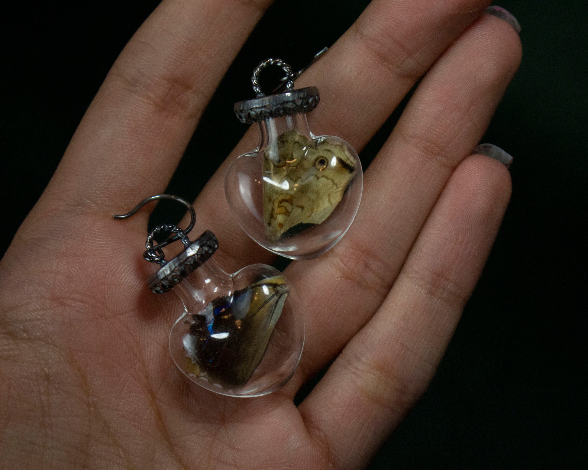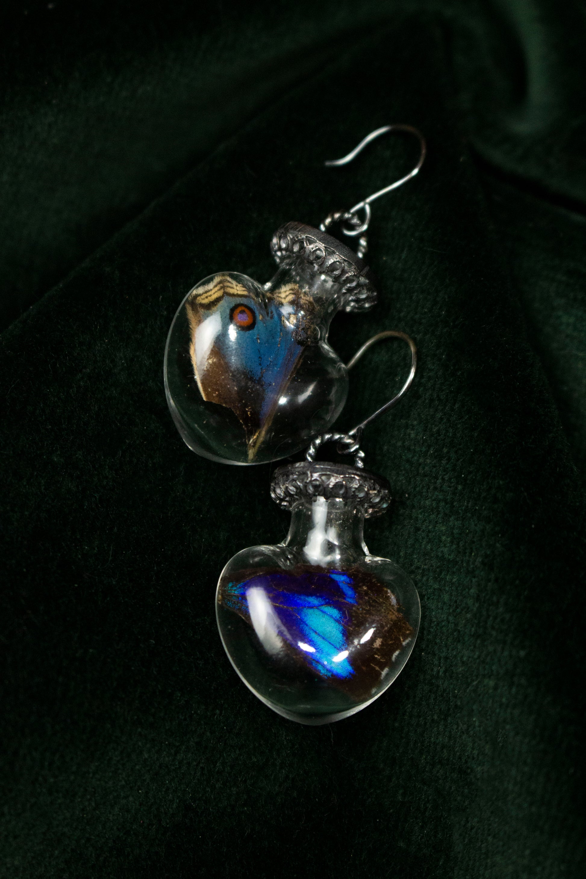This pair of earrings features two heart shaped little jars each trapping a small, shiny, multi-colored butterfly wing,