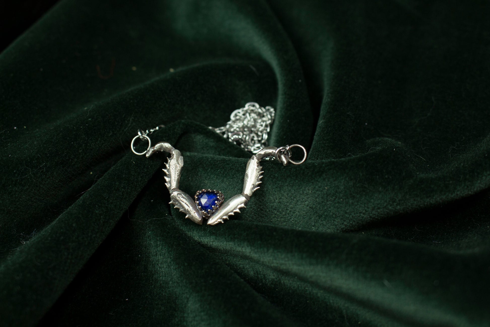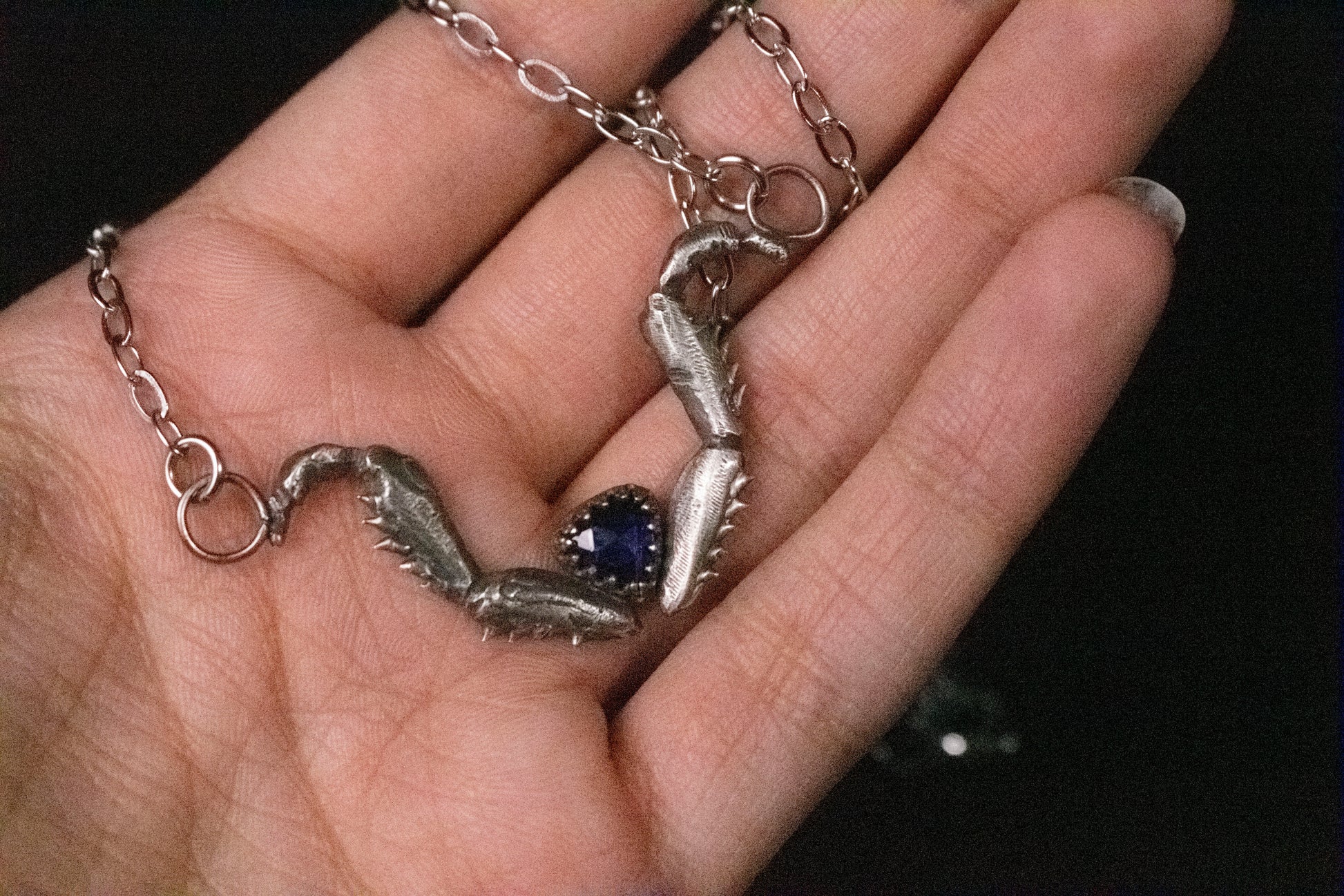 Mantis arms hand carved from wax and cast in solid sterling silver, rose-cut blue kyanite set in the center,