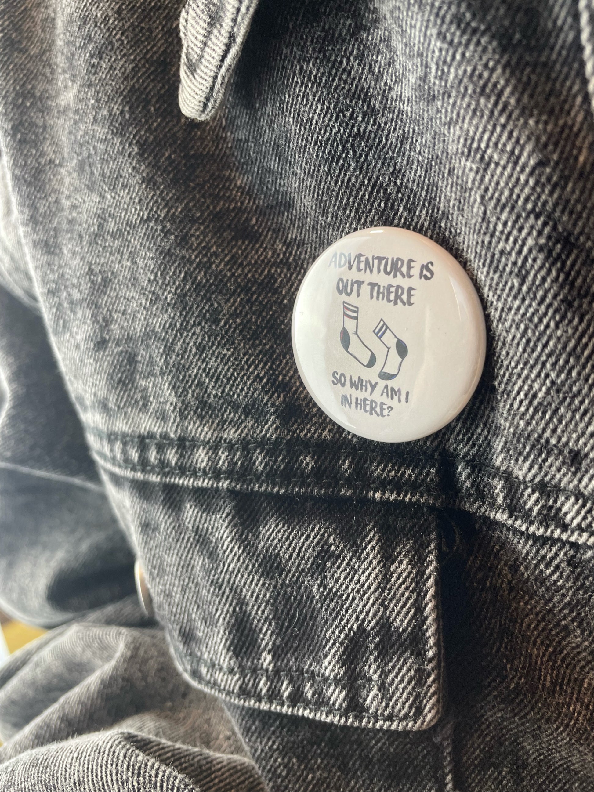 AJR 'Adventure Is Out There' themed 1.5'' button with the text "Adventure is out there, so why am i in here?"