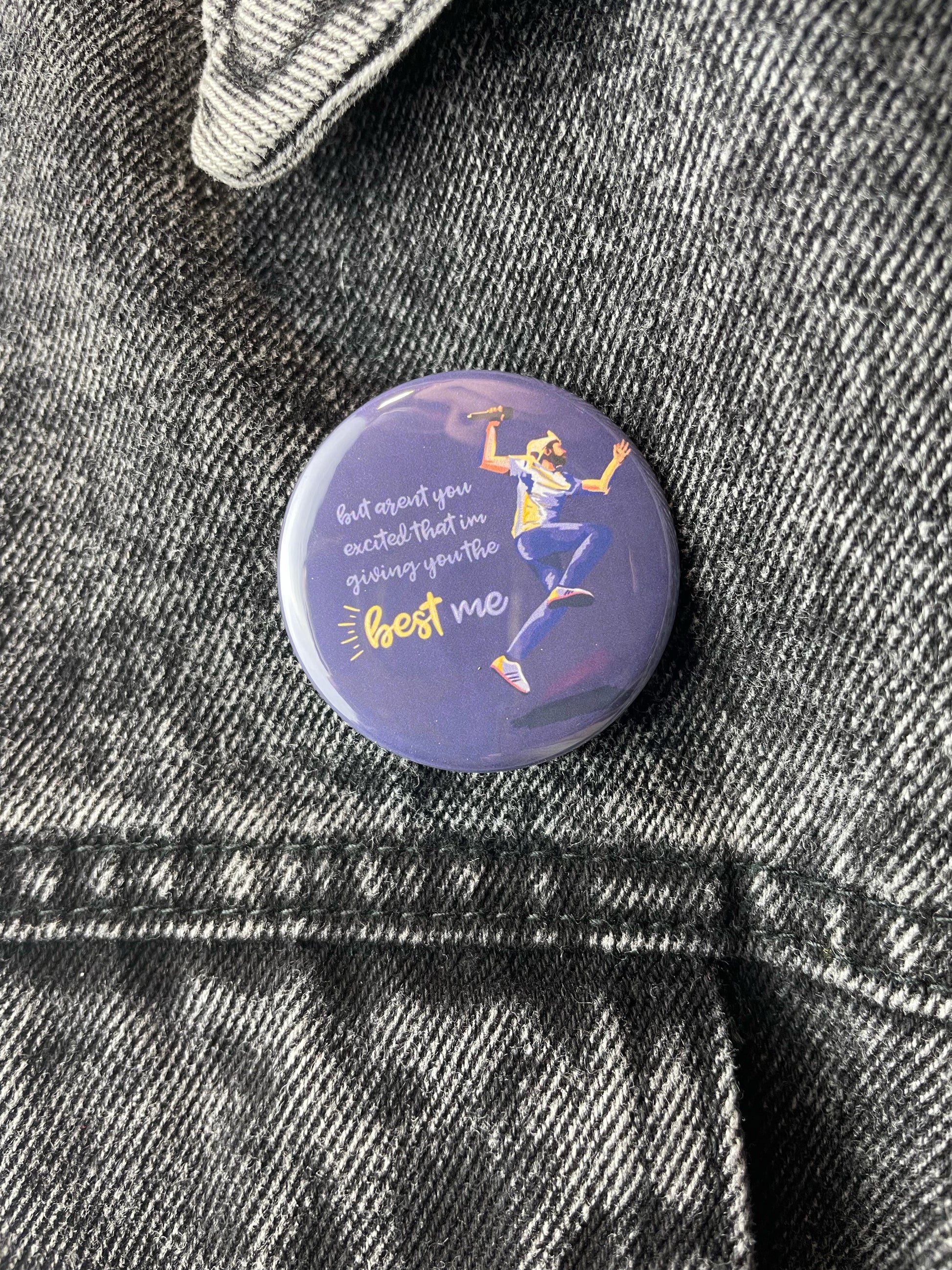 AJR 'Humpty Dumpty' themed 1.5'' button with the text "Aren't you excited that im giving you the best me?."
