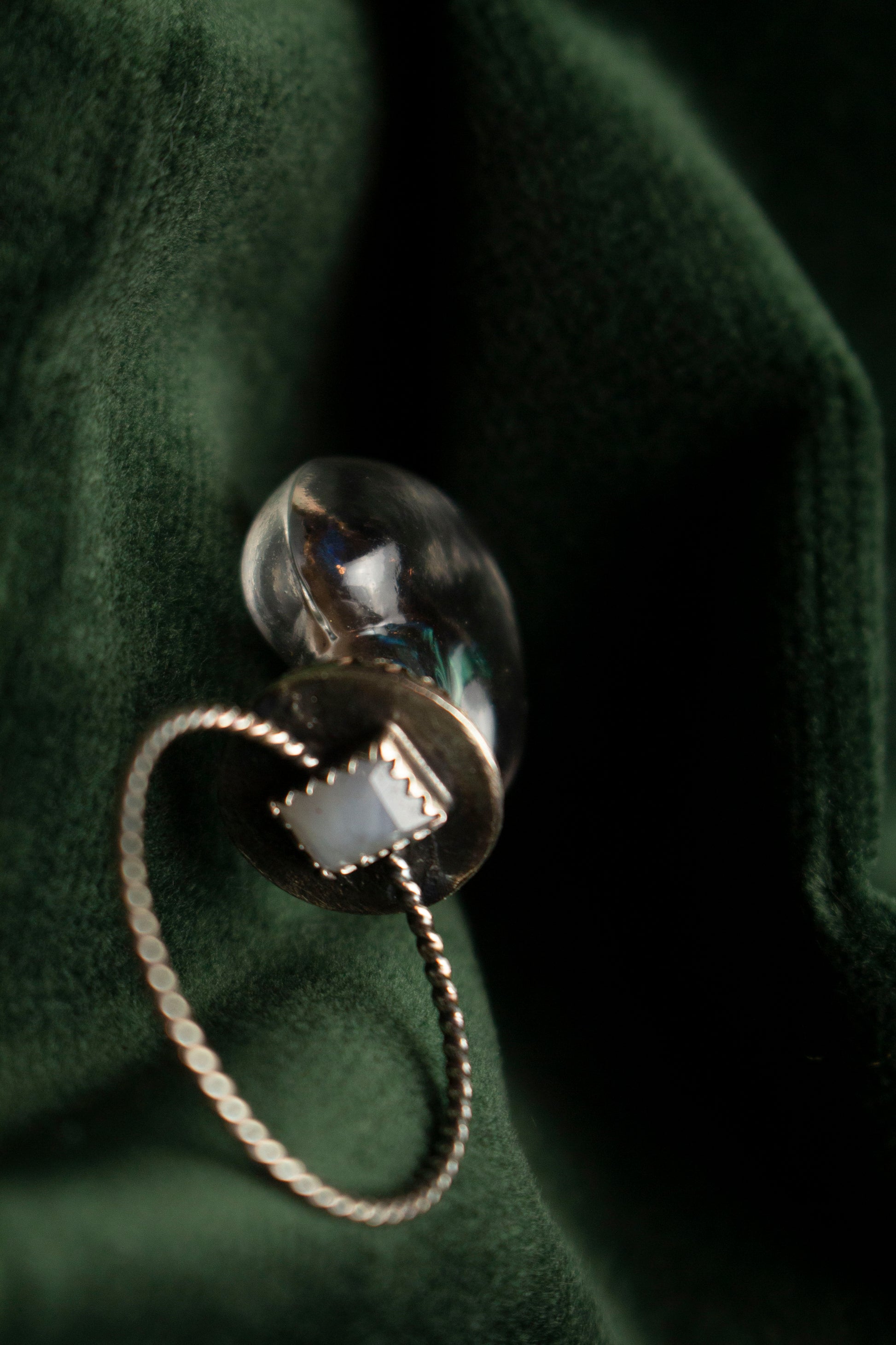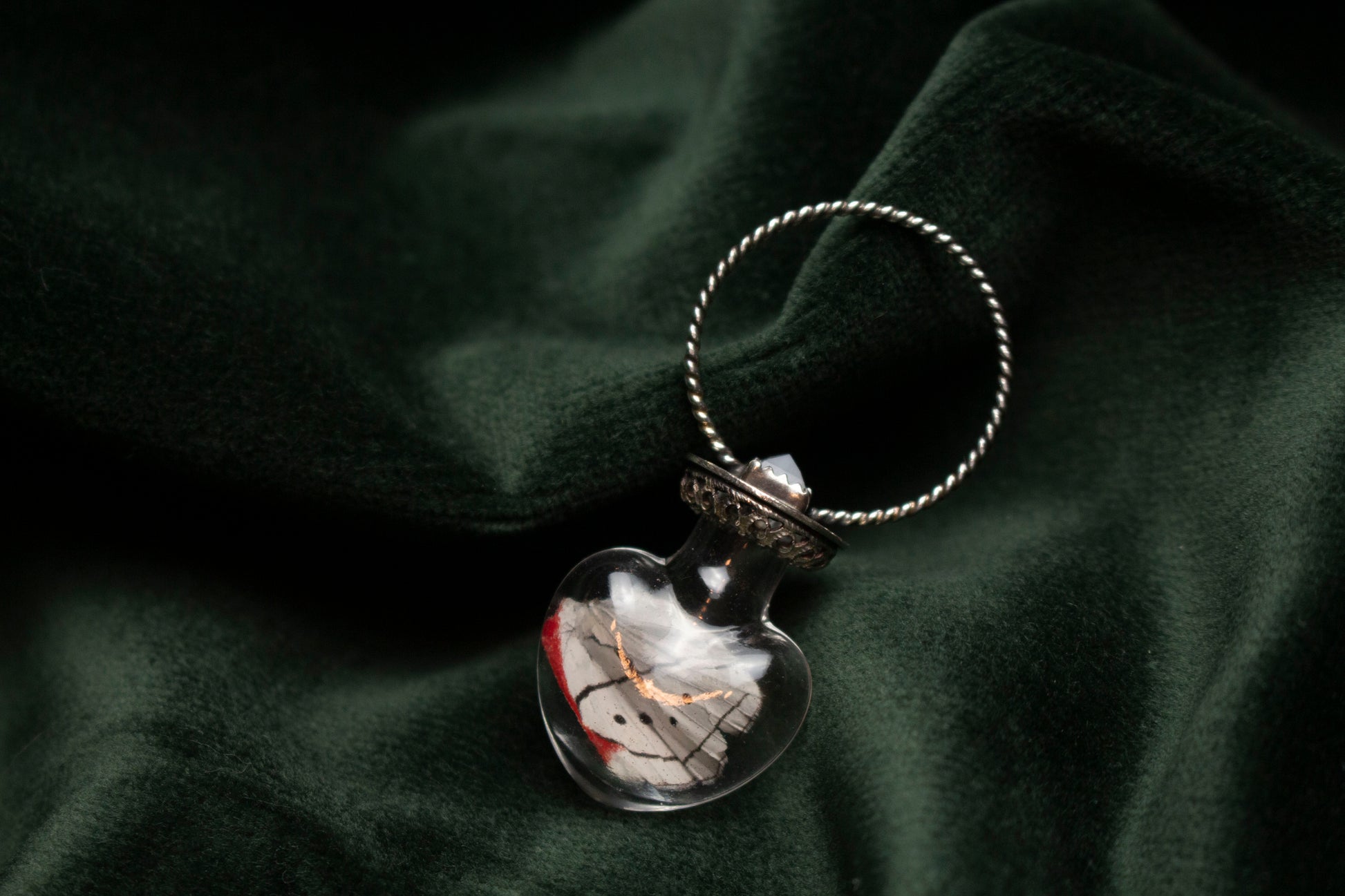 A delicate multi-colored butterfly wing encased in a small heart shaped jar with rainbow moonstone set at the top of it.