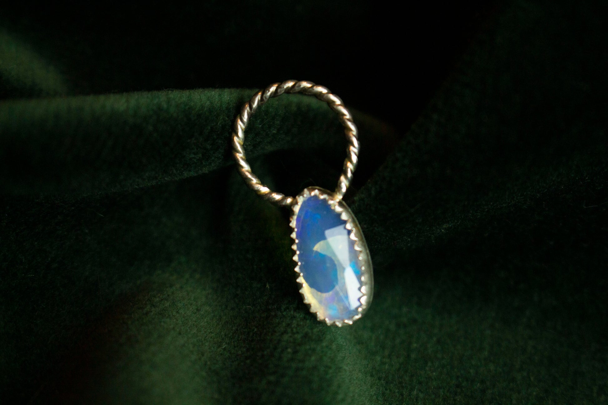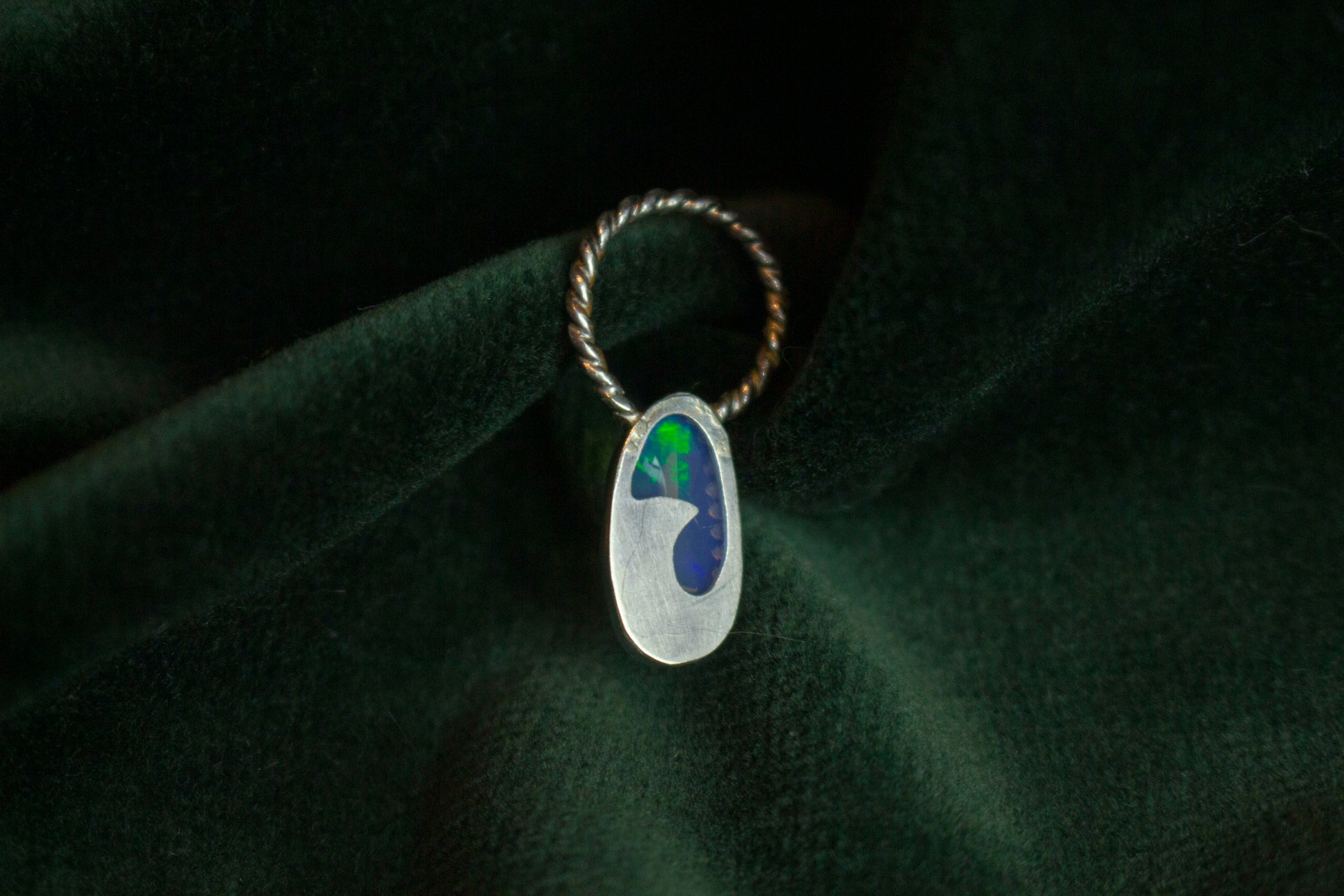 Ocean waves backing a sparkling opal stone in a small pendant.