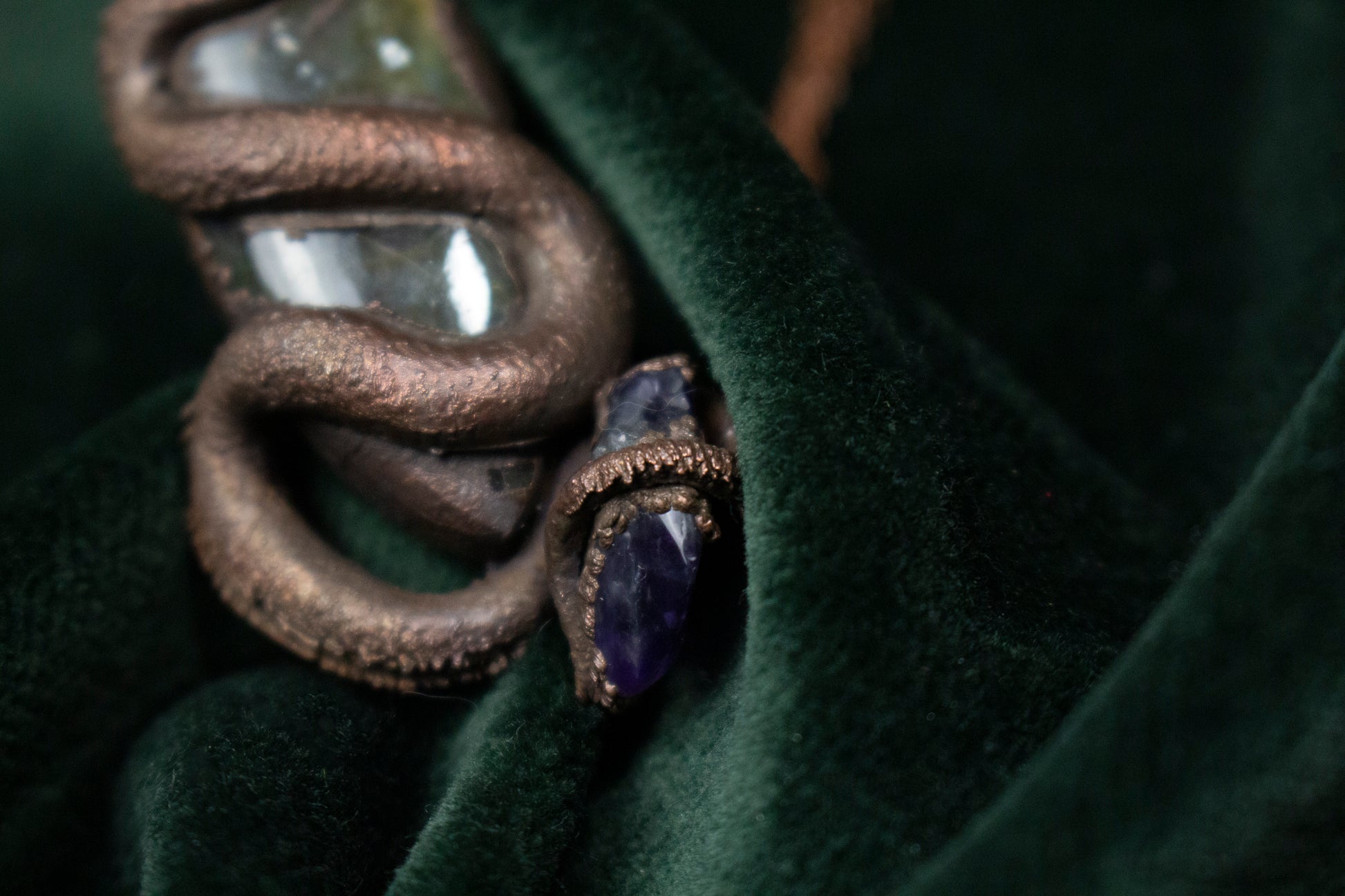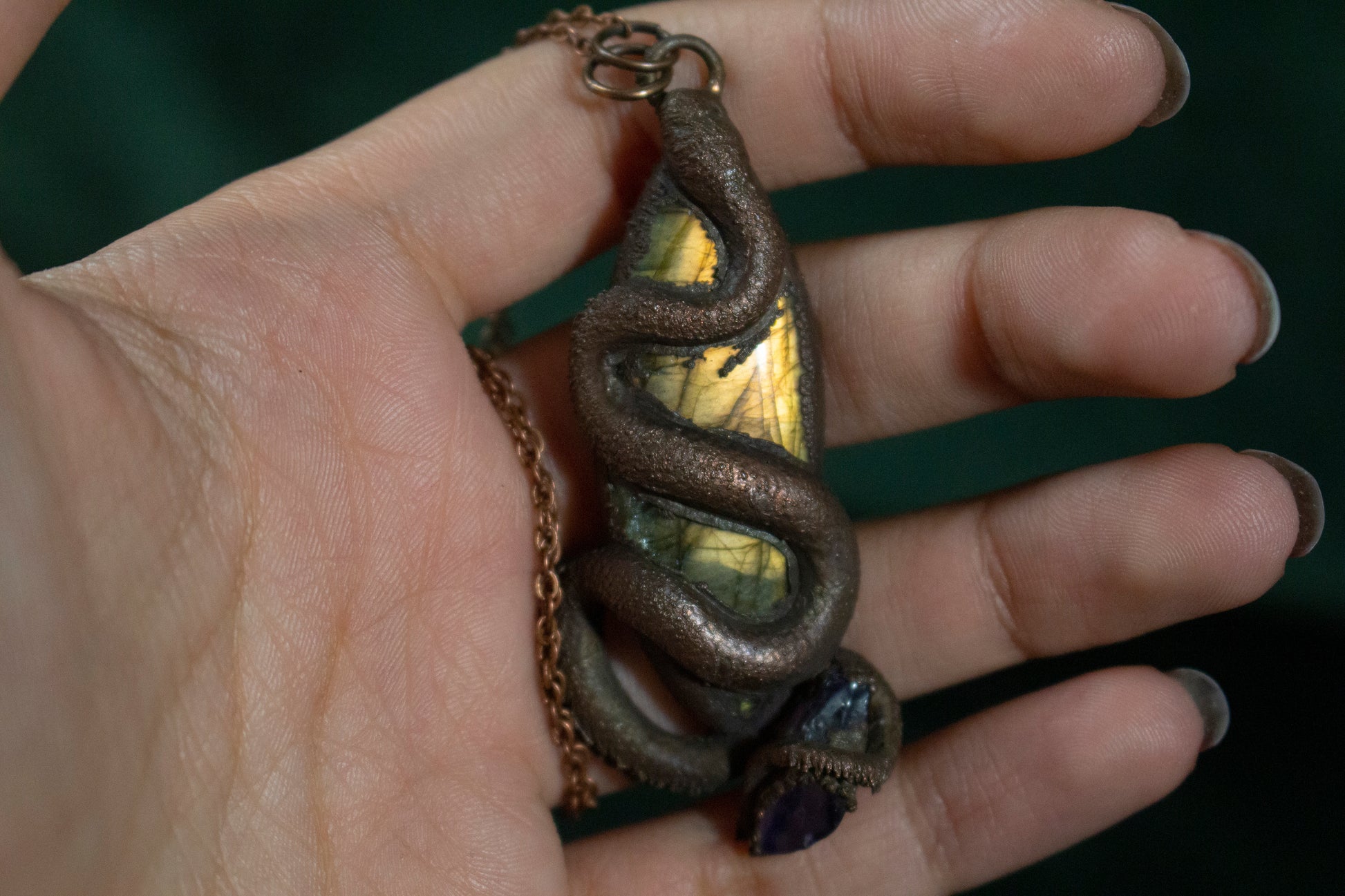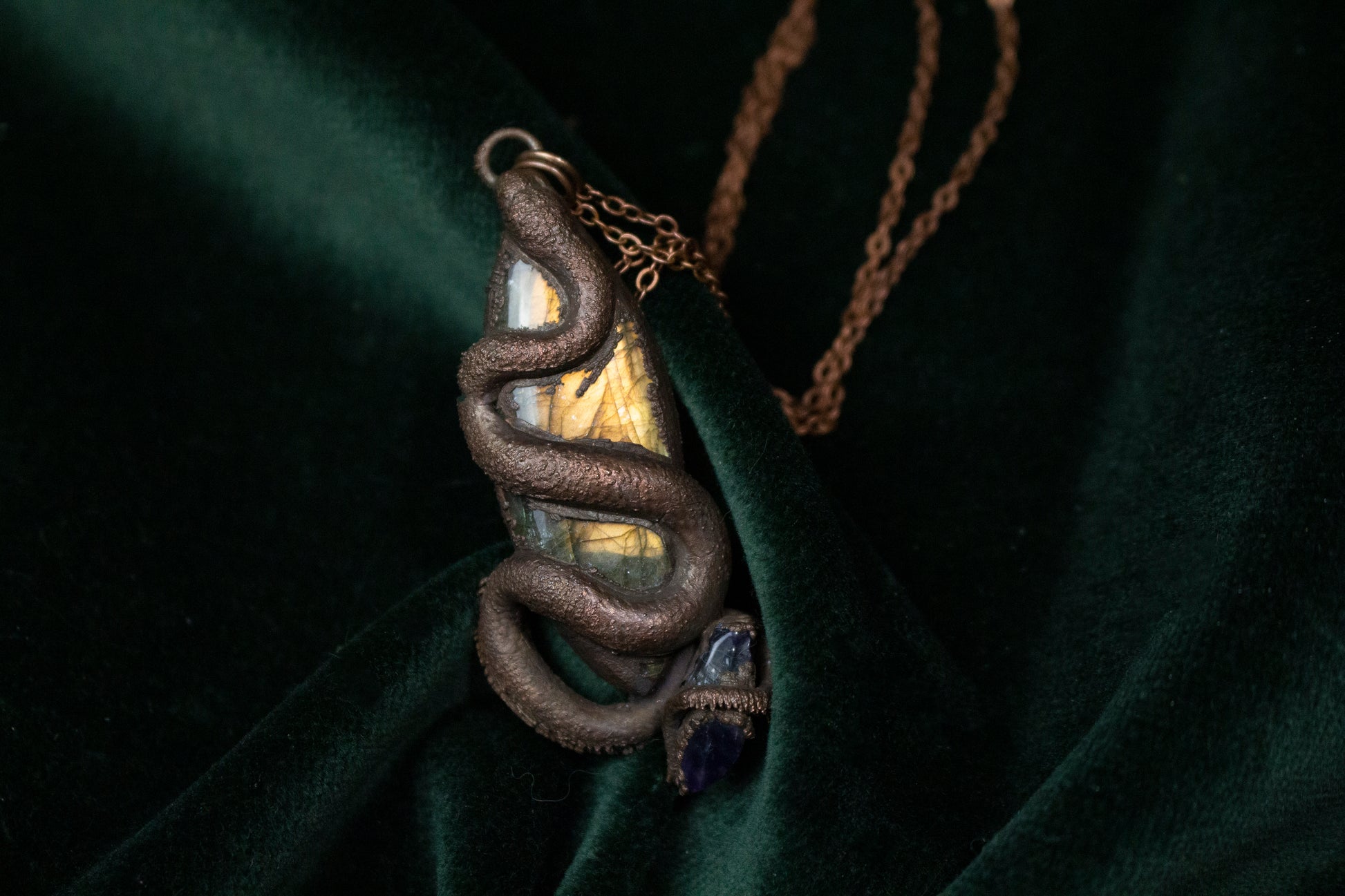 This pendant features a large golden flashy labradorite stone with a snake slithering up to the top, and a small chunk of rough tumbled amethyst held on at the end.