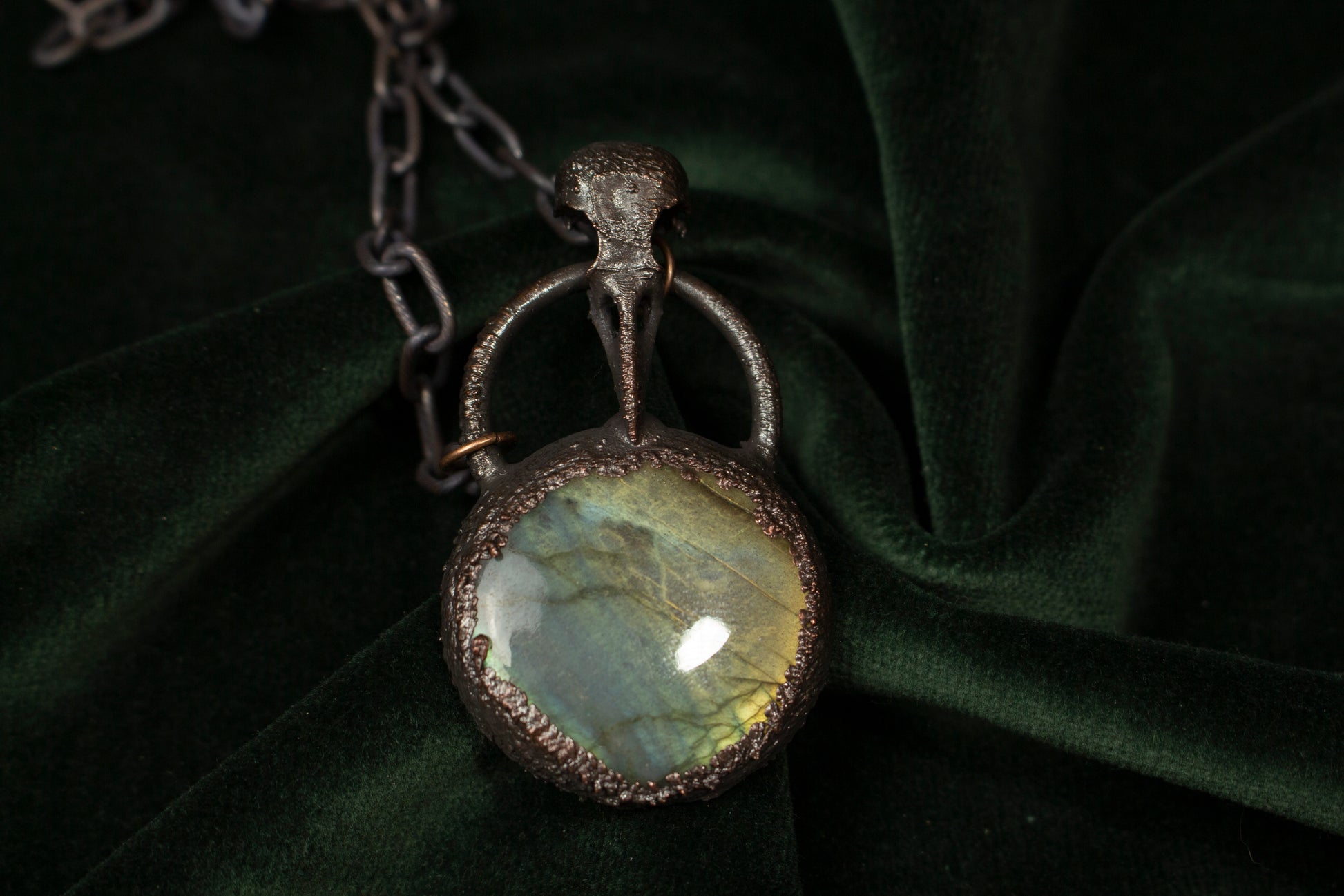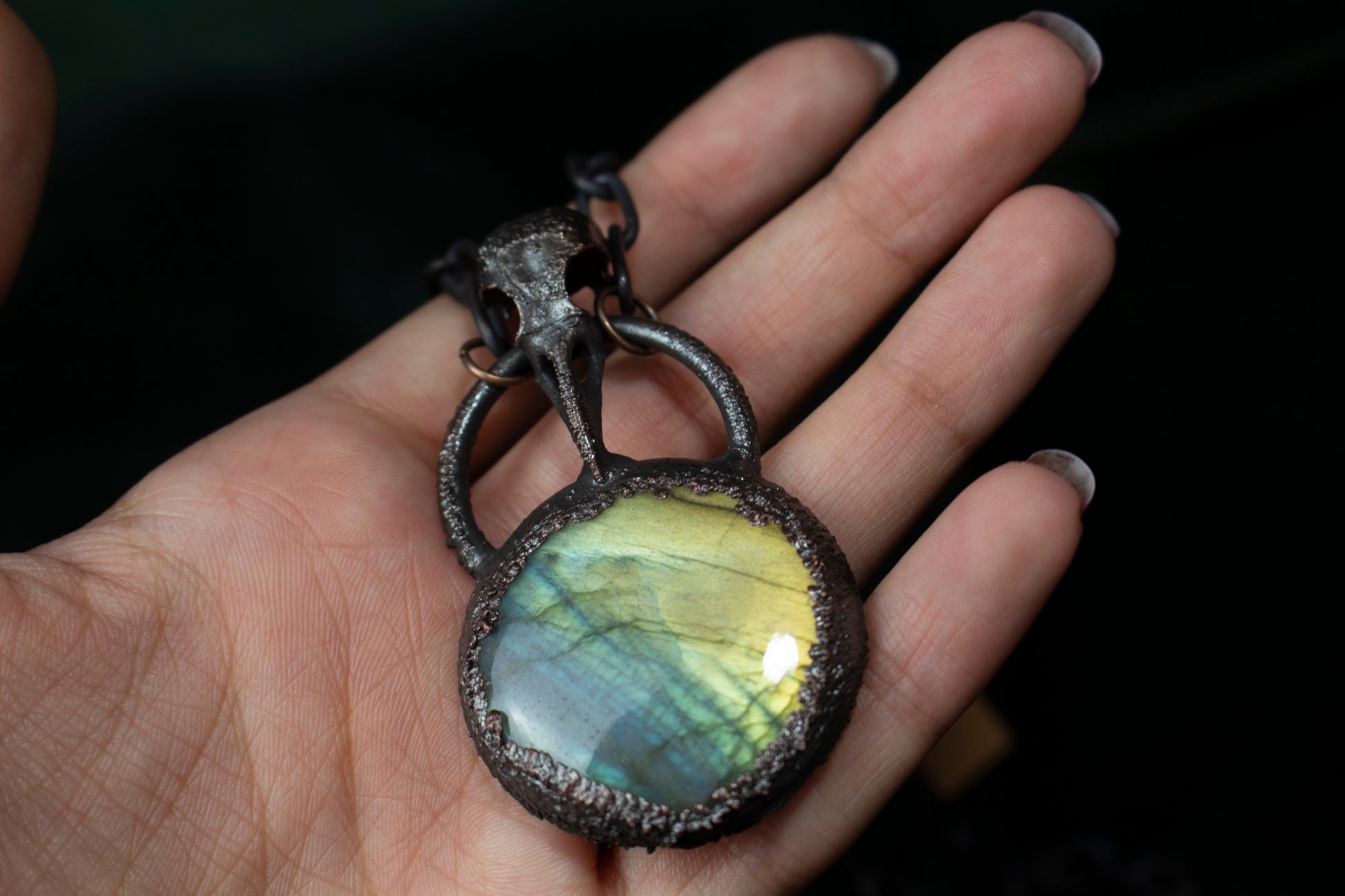 This large pendant includes a 3-D printed bird skull linked to a bright and flashy blue labradorite stone and plated in thick layers of copper using a process called copper electroforming.