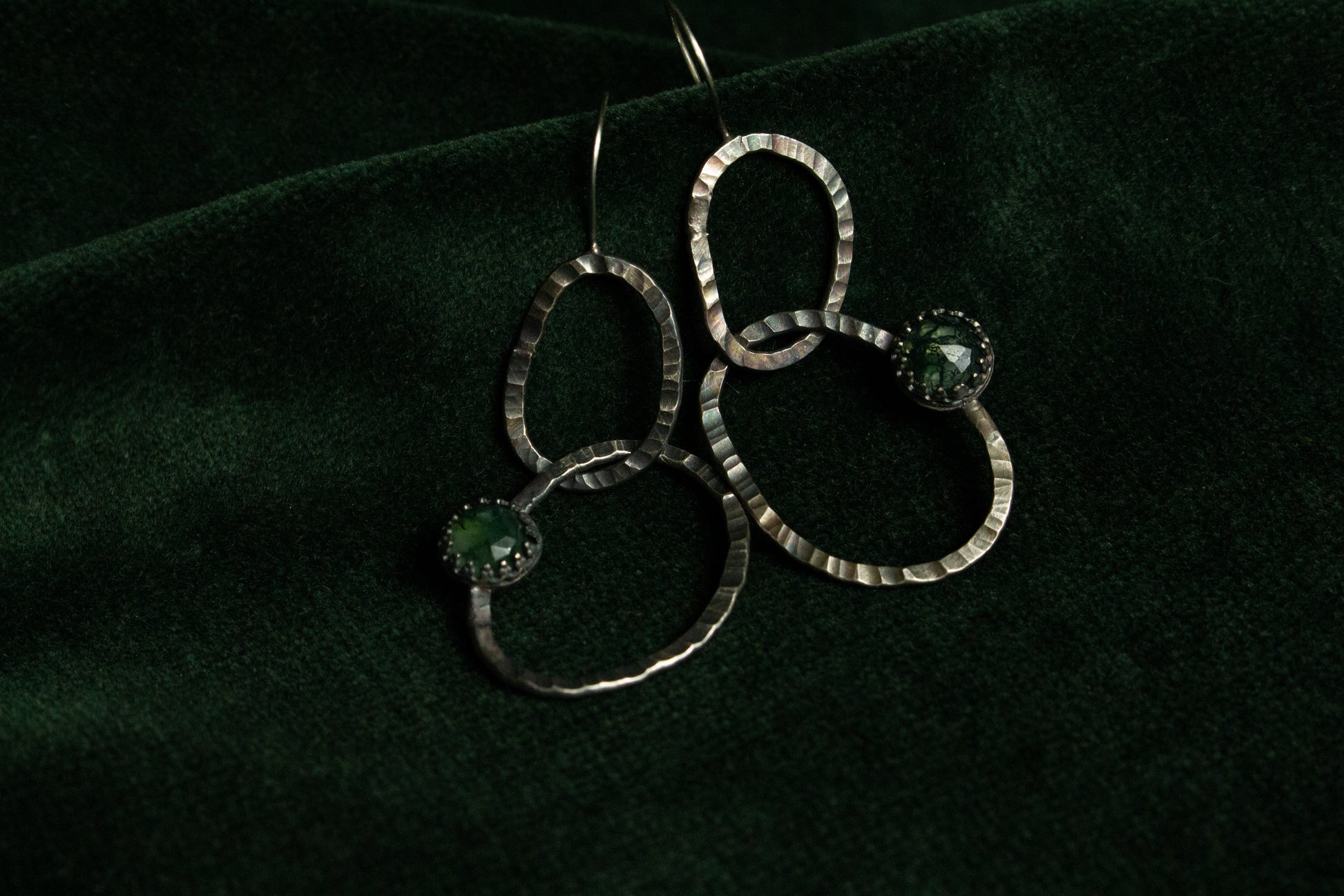Lightweight hammer textured chain earrings with faceted moss agate stones bezel set into them to add a pop of green.