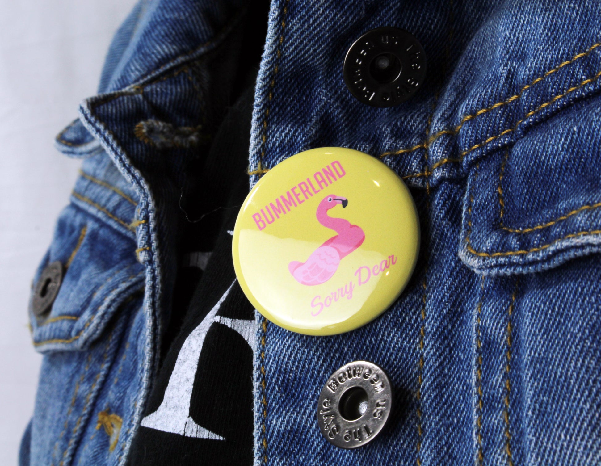 AJR 'Bummerland' themed 1.5'' button with the text "Bummerland, Sorry dear." and a flamingo design