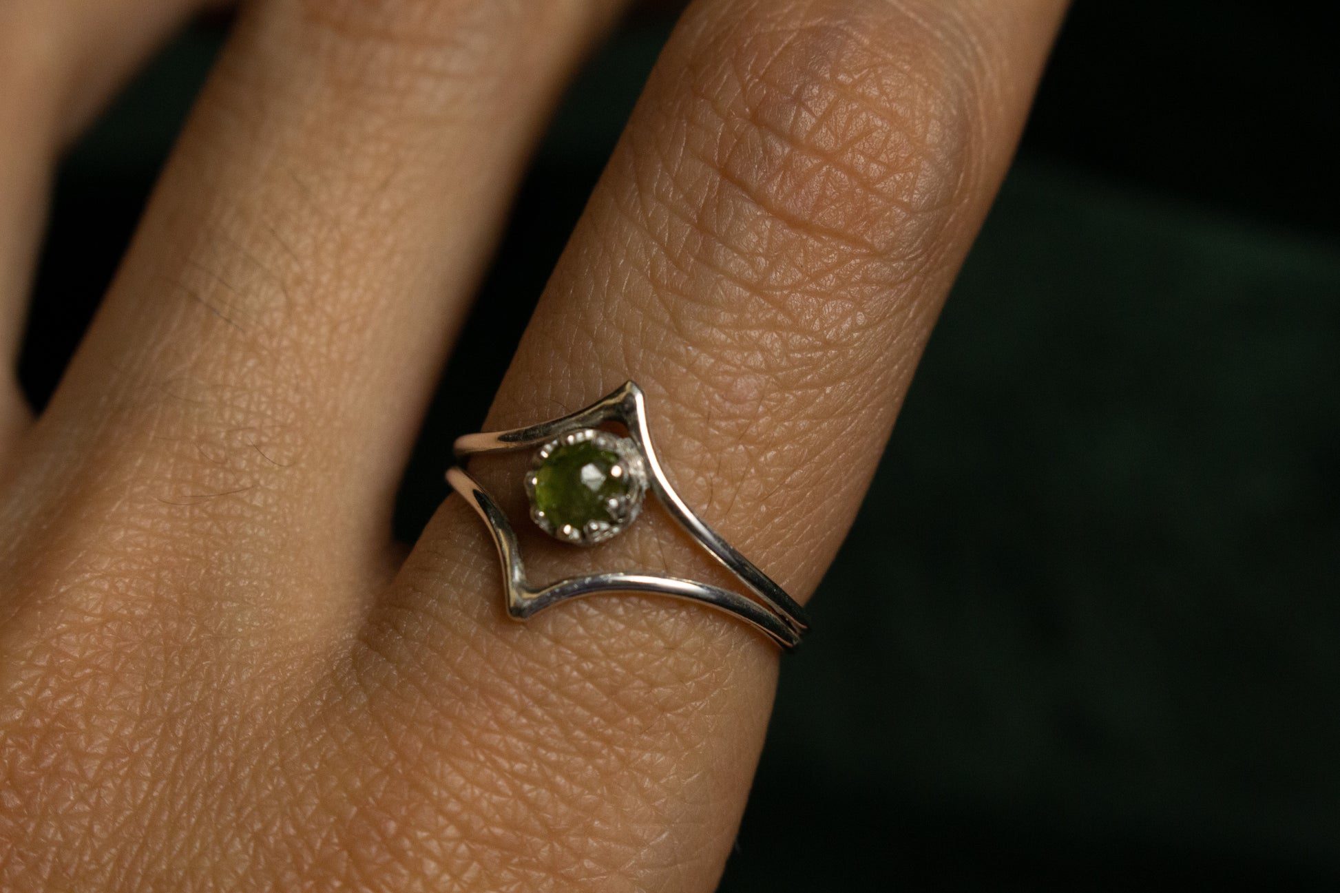 Delicate twinkling ring featuring a bezel set faceted peridot stone.