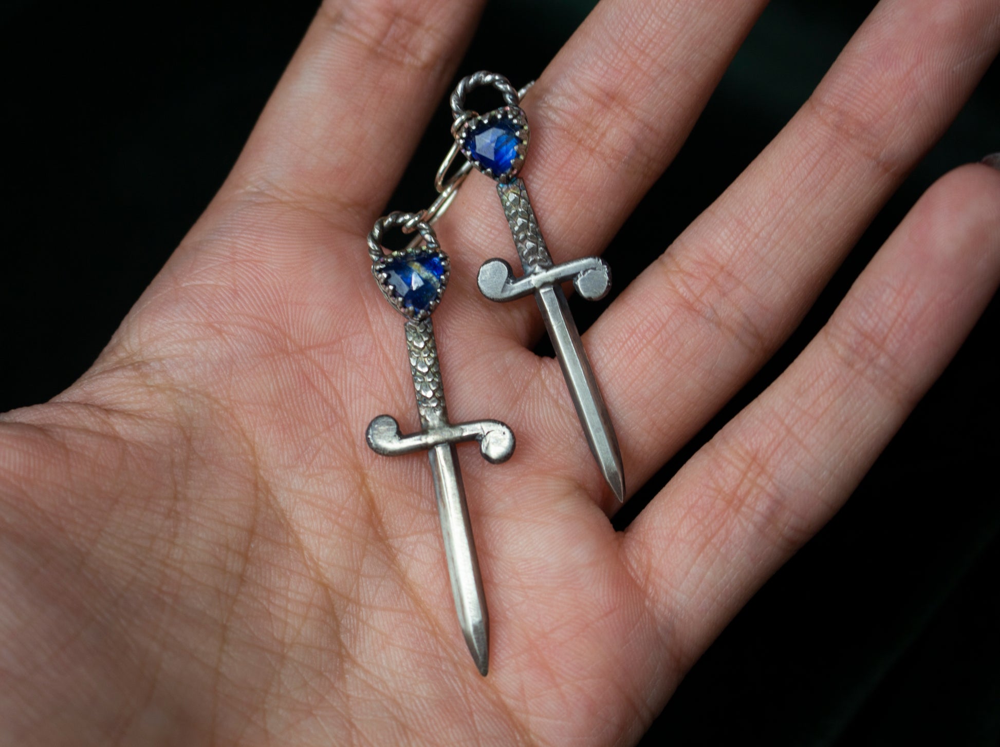 A pair of small dagger earrings forged and fabricated by hand with a bright blue rose-cut kyanite stone set at the top of each, and snake skin detailing on the handles.